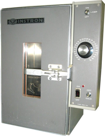 | Instron Tensil Test chamber Model #311 Internal Dimensions: 9.5" X 9" X 19" External Dimensions: 18.5" X 23" X 22" Temperature Range: -70 to +200 Deg. C Instron Analog Control, Stainless Steel Interior Includes Window 1X 1" Dia. Top Feed-Thru Port, 1x 2" Dia. Bottom Feed-Thru Port Power: 120V, 1Ph, 10 Amps Stock #109J |