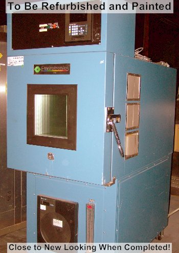 | Envirotronics Temperature Humidity Chamber Model EH8-1-2 Internal Chamber Dimensions: 24-(wide) x 24-(deep) x 22-(high) Temperature Range: -30C to +177C (single stage 1HP Water Cooled Compressor) Humidity Range: 20% to 95%RH Systems Plus Programmable Temp/Humidity Controller Over and Under Temperature Protection Controller Window in Door; Stainless Steel Interior Light Inside Chamber; Castors for Easy Movement of Chamber Feed-Through Ports in Side Walls (please inquire for sizes) Circular Chart Recorder Not Included (please inquire if required). New Environmentally Friendly Refrigerants Installed Power: 230V 3PH 50A Stock #CH-343i |