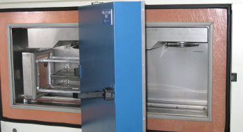 | Tenney Thermal Shock Chamber Model #TSJR Internal Dimensions: 10.5"W X 6"D X 6"H External Dimensions: 63"W X 22"D X 41"H Temperature Range: -65 to +200 Deg. C (Air Cooled) VersaTenn III Control, Over and Under Temperature Protection LN2 Mechanical, 2" Dia. Side Feed-Thru Port Stainless Steel Interior, Environmentally Friendly Refrigerants Power: 208/230V, 1Ph, 30 Amps, 60 Hz Stock #594i |