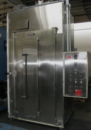 | Gruenberg Oven Model #C80H54M Interior Dimensions: 36-W X 36-D X 72-H Exterior Dimensions: 77-W X 58-D X 134-H Maximum Temperature: 800 Deg. F Watlow Model #988 Control; Eagle Timer Includes Castors for Easy Movement All Stainless Steel Power: 208V; 3Ph; 40.2 KW Stock #BD-767H |